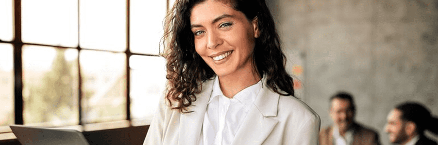 Imagem meramente ilustrativa. Empresária sorrindo e segurando anotações.